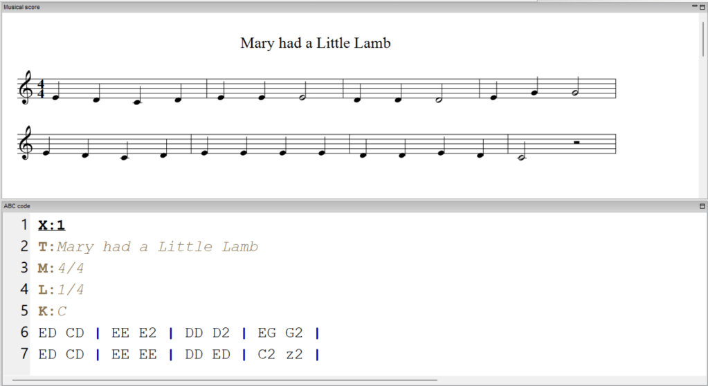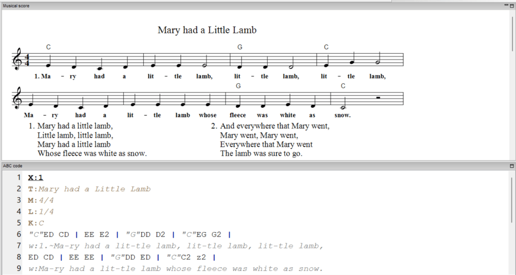 In the previous tutorial, we took a very brief introduction to writing in ABC notation with EasyABC, so if you haven’t read it, go back to make sure you’re up-to-date! This time, we’ll be adding lyrics, chords and some more headers to our “Mary had a Little Lamb” file.