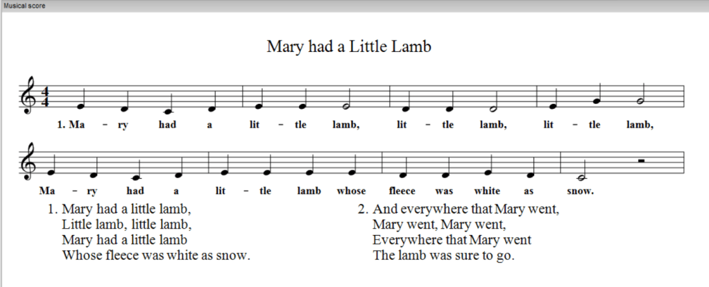 The Lyrics to ‘Mary had a Little Lamb’ are attributed to Sarah Joseph Hale, and the tune to Edwin Pearce Christy. Although these authorships are somewhat unsure, we still might like to notate this, which we can do with the “C:” field. Here’s this final addition to our ‘Mary had a Little Lamb’ file.