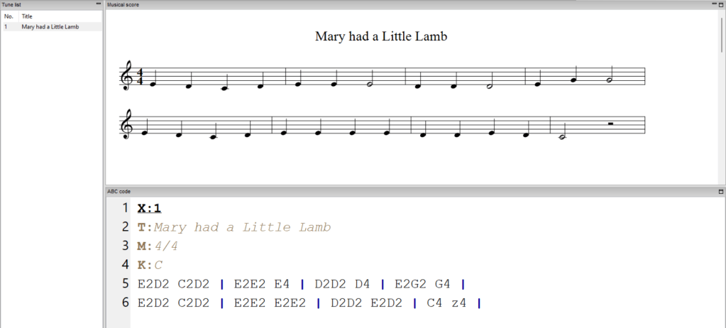 How will anybody know what our piece of music is called? Well, with the “T:” field of course! In the case “T: Mary had a Little Lamb”. Notice that the title appears in the ‘tune list’ pane on the left-hand side, allowing quick navigation around our ABC file.