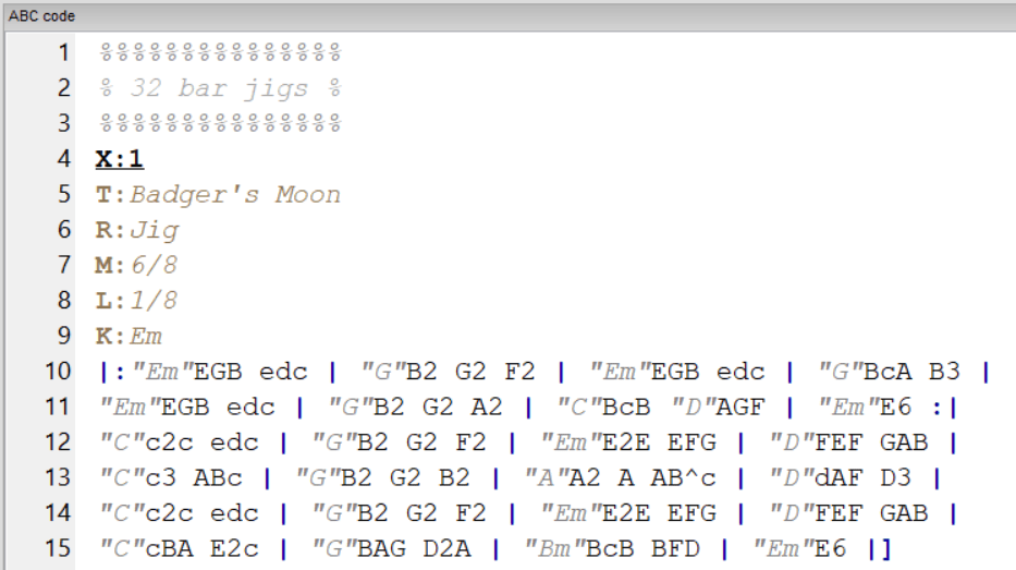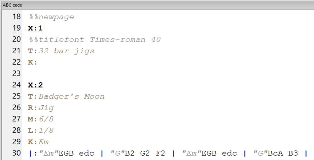 The tunebook I was dealing with was organised by tune type, with each different section denoted as below, where the tune type is surrounded by ‘%’.